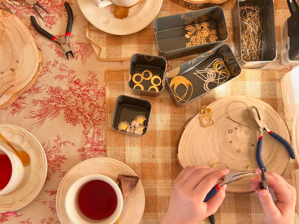 Vous y apprendrez les bases. Vous pourrez monter plusieurs paires de boucles d’oreilles/ bracelet ou collier et repartirez avec un modèle au choix !