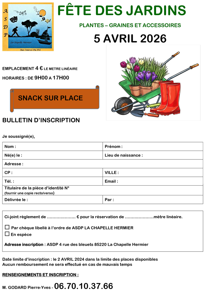 • Tarif emplacement : 4 € le mètre linéaire - Sur inscription avant le 2 avril 2026