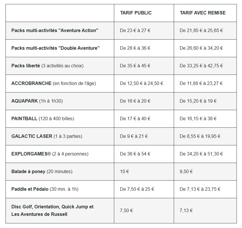 Et bonne nouvelle : en passant par l’Office de Tourisme, vous bénéficiez de tarifs avantageux sur toutes les activités du parc !