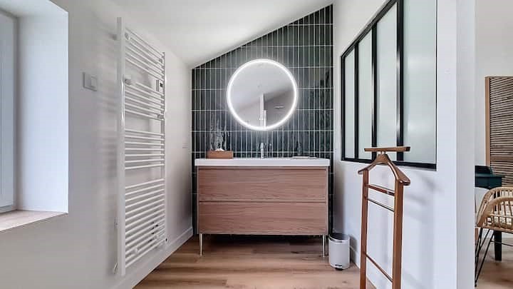 Salle d'eau attenante avec WC suspendu, douche fermée 120x90, meuble vasque 120cm, sèche serviette électrique, sèche cheveux et un banc.