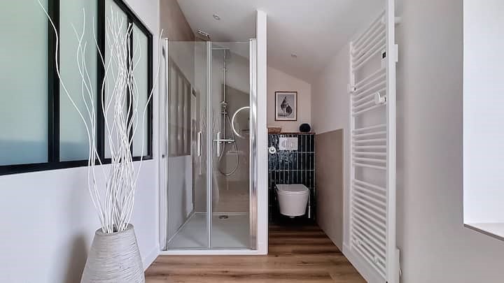 Salle d'eau attenante avec WC suspendu, douche fermée 120x90, meuble vasque 90 cm et colonne de rangement, sèche serviette électrique, sèche cheveux et un banc.